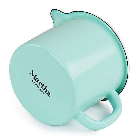 This Martha Stewart 2.5 cup measuring cup is the perfect combination of stylish and functional. Prepare your favorite meals with this handy tool. Features marked cup and liter lines on the inside for easy measuring and a pour spout to prevent spillage. Constructed with enamel coated steal that is durable, long lasting, and chip resistant. Hand wash only, not microwave safe.