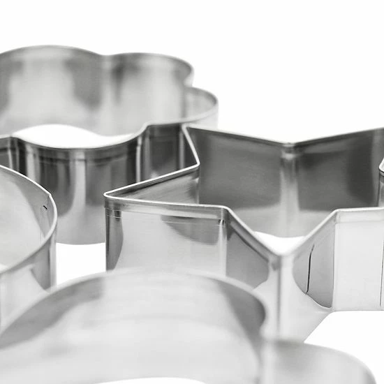 The 5 piece cookie cutter set by Martha Stewart will have you baking and decorating in no time! This set comes with assorted shapes that are perfect to use for all seasons. Have the kids join in and turn your cookie making into an interactive experience with the star, heart, flower, snowflake, and circle shapes. Designed with sturdy stainless steel construction that will hold its shape for a lifetime and create clean edges for even, uniform cookies. Features one dull edge for pressing and one thin edge for a clean cut every time.