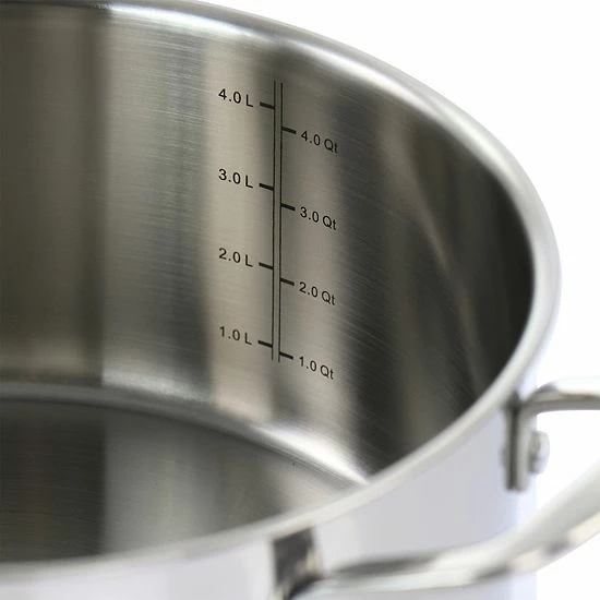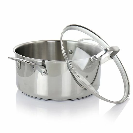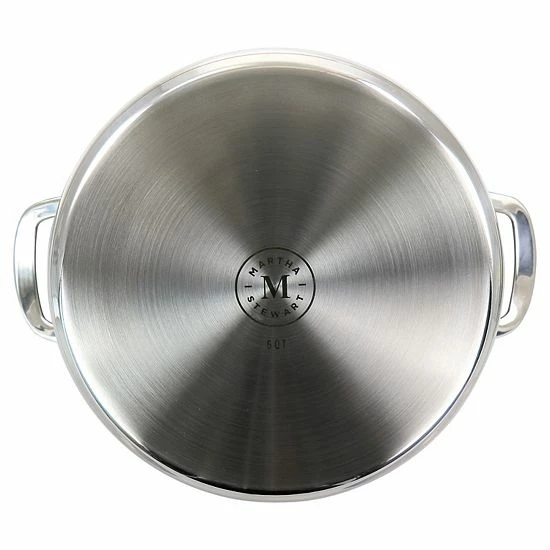 The Martha Stewart 5 Quart Stainless Steel Dutch Oven with Vented Glass Lid is a solid choice for any pro or home chef. Its’ 18/8 stainless steel body with aluminum base provides proper and even heating for efficient cooking. This cookware piece is oven and broiler safe up to 500F with the glass lid able to withstand up to 350F. Includes etched lines with in the pot for easy measuring. Dishwasher safe for easy and convenient cleaning but avoid bleach or citrus additives. Create mouth watering stews, hearty bone broths, or a cozy family portion of hot chocolate.
