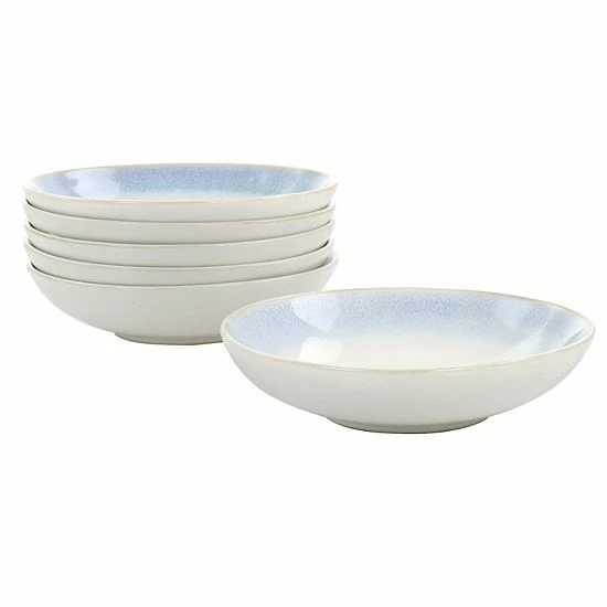 Serve guest with the stunning display of the Martha Stewart Blue Rim 8.25 Inch 6 Piece Stoneware Dinner Bowl Set. These stoneware bowls fashion a natural off white color with a shore like blue gradient that trickles down the interior. The stoneware body gives a satisfying weight to every piece while providing proper durability. For ideal convenience, this bowl set is dishwasher and microwave safe. Enjoy a hearty bowl of oatmeal in the morning, cozy up to some tomato soup, or delight yourself to generous helping of ice cream.