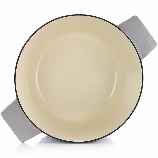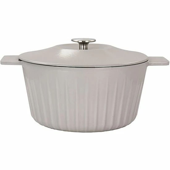 This medium 5 quart enameled cast iron dutch oven is the perfect combination of versatile and stylish. Constructed with durable cast iron that distributes and retains heat evenly, helping you to cook and bake your favorite dishes with the best result. Enameled surface is nonstick and easy to clean and the integrated handles let you move from stove to oven to table with ease. Beautiful and simple embossed stripe on outside adds an element of design. This pot is perfect for cooking, baking, reheating, and serving. Oven safe up to 500 Degrees Fahrenheit. Use pot holders whenever moving or lifting hot cookware. Compatible on all cooking surfaces including the oven, broiler, and on the barbecue. Not dishwasher safe, do not use metal utensils.