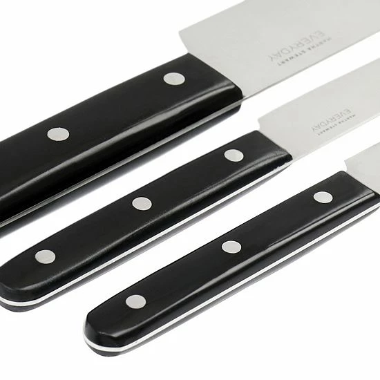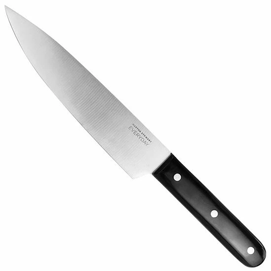 This 4 piece stainless steel cutlery set by Martha Stewart comes with your every day cutlery necessities. Set includes one 8in Chefs knife, one 5in utility knife, one 3.5in paring knife, and one set of kitchen shears. This cutlery set is the perfect go to for when you need to add on to your cutlery collection or for when you simply need the basics to complete your every day cooking prep. Constructed with high-carbon stainless steel blades that stay sharp longer for easy cutting of all food types. Ergonomic triple riveted full tang handles provide balance, comfort, and durability.