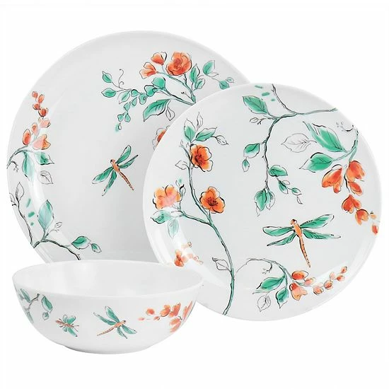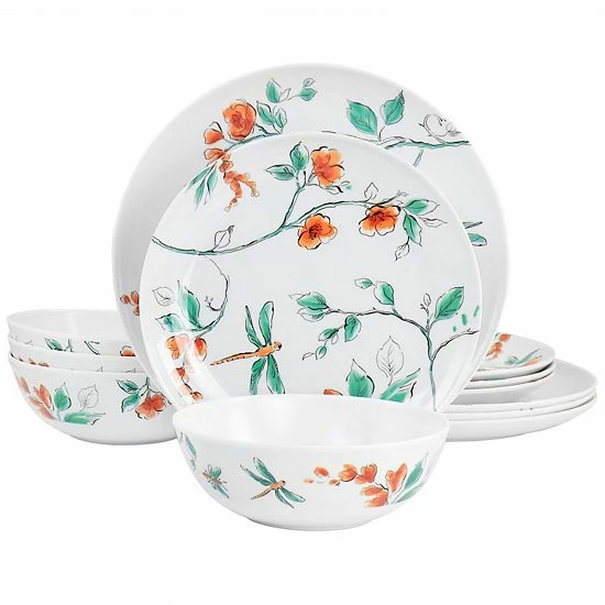 This Dragonfly dinnerware set by Gibson Everyday is whimsical, fun, and perfect for light outdoor or indoor dining. This set includes four dinner plates, four salad plates, and four cereal bowls, each with a watercolor floral design. The lightweight melamine material is durable and long lasting, making it easy to use with kids or on days when eating outside sounds better! Top rack dishwasher safe means easy and fast clean up.