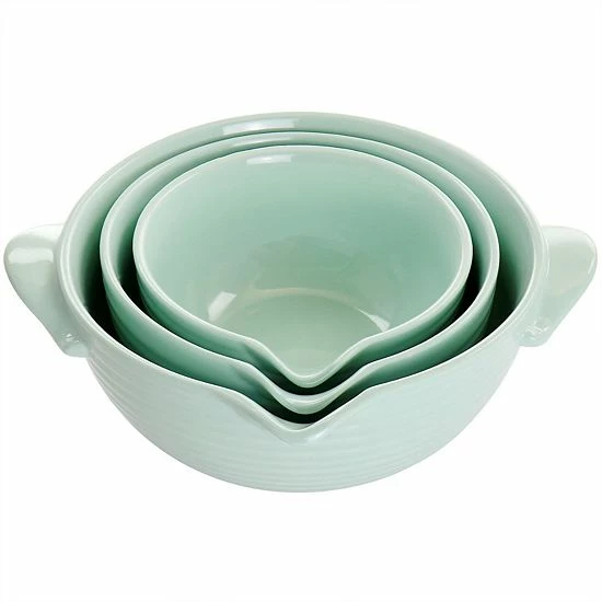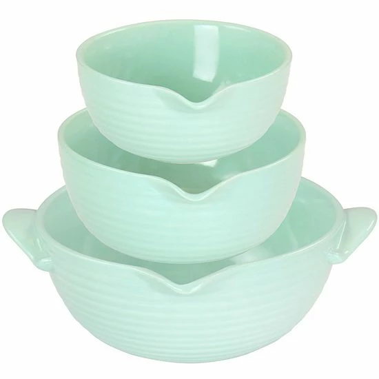 The Gibson Everyday prep bowl set is perfect for preparing small to large batches of goodies at home! This et comes with three bowls in various sizes to meet all your preparation needs when it comes to cooking and baking. Set includes one 3.5qt bowl, one 2.25quart bowl, and one 1.25qt bowl. Large batter bowl features handles and all three bowls have a pouring spout, making your prep work that much easier to pour and hold. Constructed with durable, long lasting stoneware material that is completely microwave and dishwasher safe for easy clean up and fast re-heat. Embossed outer stripe design is simple yet beautiful. Bake and prep with style with this set by Gibson Everyday!