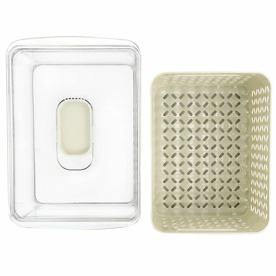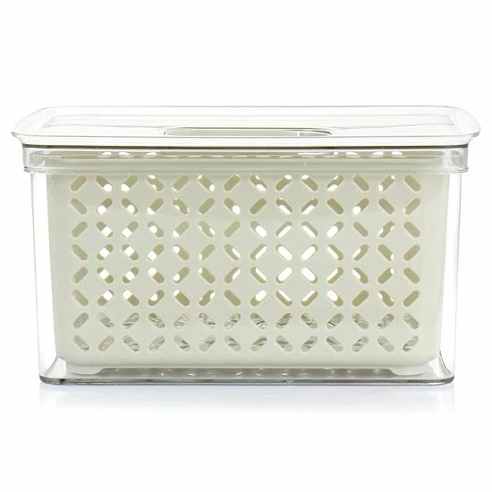 This Gibson Everyday Fresh Keeper Container is the perfect container when you need to keep food well ventilated and well contained. This set comes with a removable basket and outer container with a vented lid slider. The removable basket can act as a colander to wash produce while the elevated bottom promotes airflow and a space for liquid drainage to prevent spoiling. Vented lid at top controls humidity to keep different food types fresh. This Dual function set can be used as one piece or separated and saves you space with its stackable storage design!