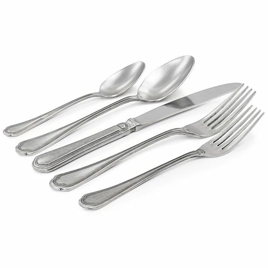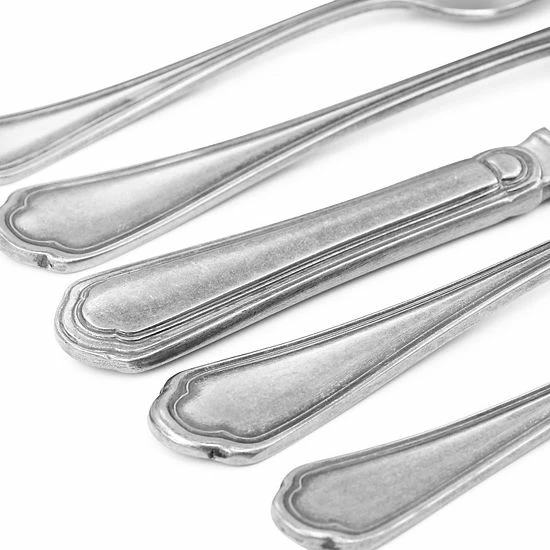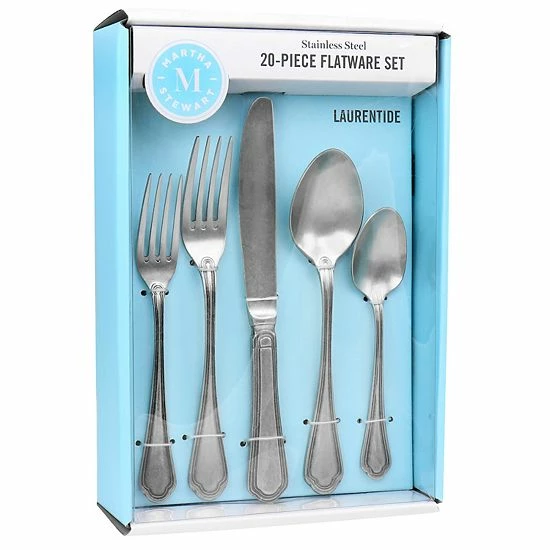 The Martha Stewart Laurentide 20 Piece Flatware set comes with full service for four people. Including dinner forks, salad forks, dinner spoons, tea spoons, and dinner knives, this set will complete your table. Constructed with heavy weight stainless steel material, it is sure to last you through countless dinners. A beautiful ornate embossed rim adorns each handle and adds a touch of classic elegance to this set. Dishwasher safe utensils- avoid detergent containing lemon for a longer last.