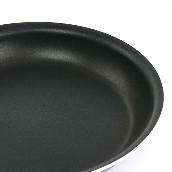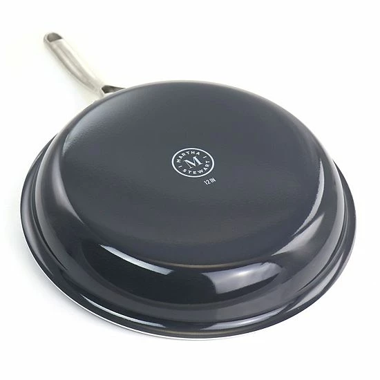 Enjoy making all your favorite home cooked meals with the Martha Stewart 12 Inch Aluminum Frying Pan. Made of durable heavy gauge aluminum for even heat distribution. The reinforced triple-layered nonstick interior makes it super easy for food release. The beautiful porcelain enamel exterior adds a long lasting shine and quick clean up. The riveted stainless steel handles adds stability and strength, complete with holes for hanging storage. It is oven safe up to 480 degrees Fahrenheit and is PFOA-free. This Martha Stewart frying pan is just one of the amazing pieces you can get for your home kitchen. Complete the entire collection to truly feel right at home.