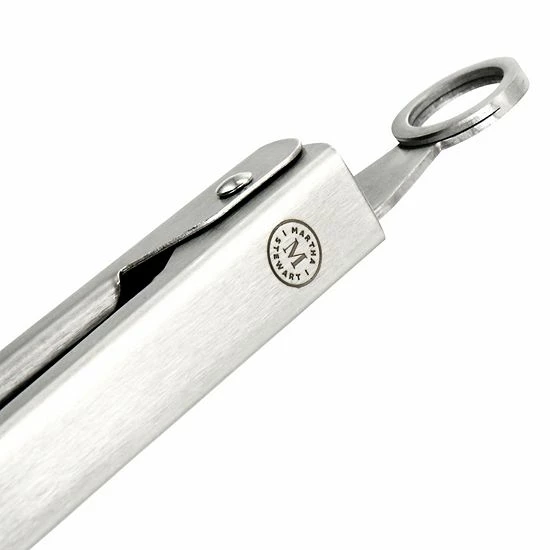 Enjoy cooking or serving your favorite meals with these Martha Stewart stainless steal tongs. Constructed with quality brushed stainless steel, these tongs are strong and durable and make cooking a breeze. Use to rotate, adjust, and grab food items with ease. Extra long 12in handle makes cooking in large pots easy and keeps your hands away from heat for added safety. Scalloped heads and spring design create a solid grip when clamping. Easy-lock mechanism with hanging loop for convenient and compact storage. Dishwasher Safe.